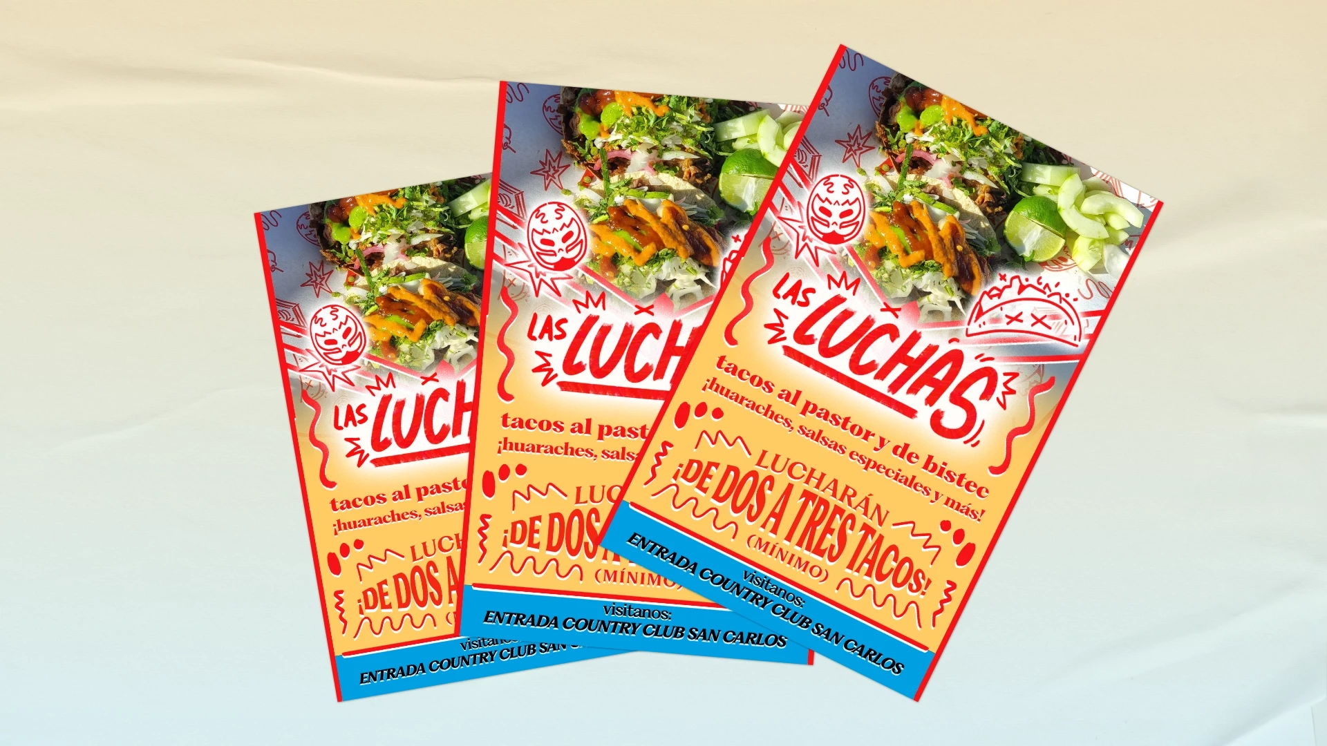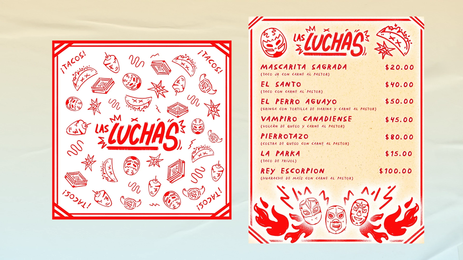 En la identidad visual de Taquería Las Luchas, un proyecto que fusiona tradición y pasión por la lucha libre. Para su re-apertura, se creó un mural vibrante para su carreta, junto con un branding que captura la energía y el espíritu del ring. Se diseñó un menú, logotipo, papel encerado y se realizó una sesión fotográfica, todo basado en ilustración y elementos icónicos de la lucha libre, logrando una imagen auténtica y llamativa que conecta con su público.